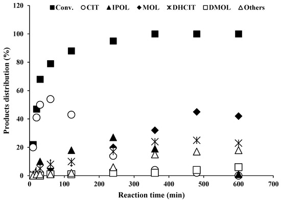 Figure 7 reveals the product distribution of the hydrogenation reaction. Based on the catalytic performance, PTA-Cat-I catalyst was observed to be an efficient and moderately selective bifunctional catalyst for menthol synthesis. The formation of other side products (e.g., citronellal ethers, methyl-4-propyl cyclohexane, cyclohexane-1-methyl-4-propylidene and menthatri-ene) was possibly observed due to dehydration, hydrogenolysis and cracking of isopulegol and menthol isomers [52,53]. From experimental data and the reaction mechanism, it was found that the bifunctional catalyst (PTA-Cat-I) also promoted side reactions (e.g., dehydration and defunctionalization of isopulegol and menthol isomers) [53]. The higher production of menthol (~45%) is probably connected with desired and balanced metal–acid sites. Furthermore, catalytic activity might be directly related to active metal sites and high surface area and pore volume of the catalyst. Furthermore, it was shown that higher heteropoly acid loading (>30 to 60%) would possibly block pores of support and metal sites, and conceivably reduce mass transfer/diffusion of substrate molecules. thereby decreasing catalytic activity and menthol selectivity.