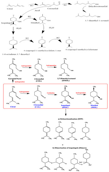 - Trasarti, A.F.; Marchi, A.J.; Apesteguıa, C. Highly selective synthesis of menthols from citral in a one-step process. J. Catal. 2004, 224, 484–488. [Google Scholar] [CrossRef]