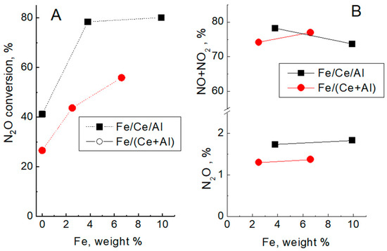 Dependence of N2O conversion (A) and (NO + NO2) and N2O yield at NH3 oxidation (B) on Fe content at 800 °C for Ce/Al and (Ce + Al) based samples.