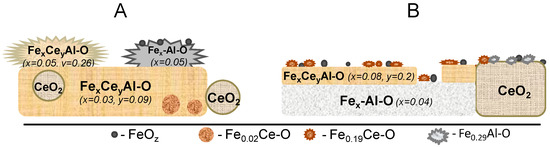 The decreasing Fe/Al ratio in Fe-Al-O compounds points to the formation of mixed oxide with most disordered near-surface layers enriched by Fen+ (Figure S6B). At the same time, the protocol of Fe supporting includes using of acidic solutions giving rise to the dissolution of some poorly crystallized alumina detected in the initial support (Figure S5A, Table 2). In this case, the formation of a γ-FeAlO3-like compound with spinel structure is quite possible after following drying and calcination at T < 400 °C [21]. Since the mutual Fe2O3 and Al2O3 solubility in such structure decreased prominently with calcination temperature rise, its decomposition could happen in our case as well leading to the formation of highly dispersed FeOx species (0.06 mmol/g) on the surface of Fe-Al mixed oxide with Fe0.05Al stoichiometry. Its quantity (1.3 mmole/g) is reasonably close to that of alumina dissolving in HCl in the initial support (1.15 mmole/g) (Table 2). Calculation showed that identified soluble compounds include all Al and Fe in the sample, while about 0.7 mmol/g of Ce, or 25% of its general content in the sample, represent insoluble oxides (Table S1 in Supplementary Materials, Table 2) which are, more probably, small sized CeO2 species with unmodified fluorite lattice (Table 1). Their spatial location in the sample is not clear, but encapsulation by Ce-Al mixed oxide preventing Fe incorporation into the lattice is quite reasonable because the same was detected for the particles of Fe-Ce mixed oxide.