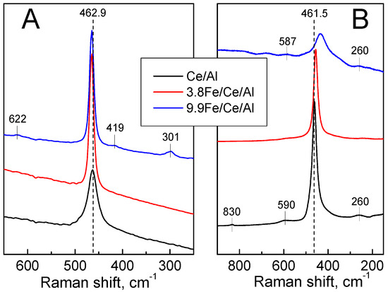 The absence of the band at ~377 cm−1 related to α-Al2O3 phases [27] in the Raman spectra giving information on near subsurface layers of all Ce/Al-based samples (Figure 3B) agrees with XRD and DDPA data. F2g mode of CeO2 at 461.5 cm−1 in the spectrum of support is supplemented by the bands at ~590, ~260 and ~830 cm−1 ascribed to the vacancy-interstitial (Frenkel-type) oxygen defects, surface mode, and peroxide (O22−) stretching vibration at the defective ceria surfaces, respectively [28,29,30]. These bands disappear in the spectrum of the 3.8 Fe/Ce/Al sample because the doping element can annihilate oxygen defects by dopant interstitial compensation mechanism [31]. The low-frequency shift of the CeO2 band and its broadening (Table 3) typical for smaller particles was detected in the spectra of Fe/Ce/Al samples which contradicts the slight increase in averaged sizes of crystalline CeO2 particles (Table 1). Therefore, the formation of highly dispersed particles of Fe-Ce mixed oxide in the surface layers of the 3.8 Fe/Ce/Al samples was detected by DDPA (Table 2) with inhomogeneous strains due to Ce3+ ions therein [15,28] can be responsible for such changes. Asymmetrical broadening with a low-energy shoulder of CeO2 band, especially prominent in the 9.9 Fe/Ce/Al sample, can result from a higher concentration of such compounds or higher content of α-Fe2O3 therein. In line with this, bands at ~260 and ~590 cm−1 appear again.