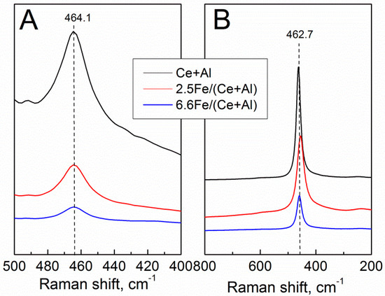 The band at 464 cm−1 which is responsible for F2g mode of fluorite lattice attenuates drastically in Fe/(Ce + Al) samples compared with that in the initial support (Figure 4A, Table 3). It is, more probably, due to the noticeable additional inclusion of Ce into alumina or Ce-Al mixed oxides with low Ce content where it exists preferentially as isolated Ce3+ ions in the presence of Fe. Indeed, Ce/Al = 0.05 in Ce-Al mixed oxide detected by DDPA in the (Ce + Al) sample but increased up to 0.09–0.26 after Fe supporting (Table 2). The absolute value of mixed oxides increased as well, while the quantity of insoluble CeO2 decreased from 2.4 mmol/g to 0.7 mmol/g (Table 2). At the same time, the position of CeO2 F2g mode in Fe/(Ce + Al) samples changed non-substantially pointing to the absence or low degree of ceria lattice modification by foreign atoms compared with the support. In this case, a slightly higher FWHM compared with that in Fe/Ce/Al samples is due to the particle size effect, which is true for crystallized particles, at least (Table 1) [15].