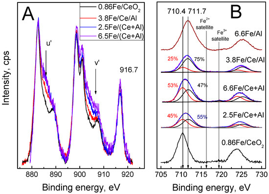 The normal complex formed due to shake-down satellites from an O1s to Ce 4f electron transfer in the Ce 3d spectra of all CeO2 containing samples (Figure 5A) was supplemented by the features marked as v’ and u’ due to the presence of Ce3+ [10]. An increase in Ce3+ fraction from 8% of total surface Ce concentration in CeO2 (spectrum not shown for shortness) up to 20% in 0.86 Fe/CeO2 sample was related to the formation of Fe-Ce–O solid solution or Fe-Ce mixed oxide [4,32]. Similar compounds of Fe0.19Ce stoichiometry have been detected in the 3.8 Fe/Ce/Al sample (Table 2, Figure 2). Therefore, there are two reasons that explain the further increase in Ce3+ fraction in 3.8 Fe/Ce/Al (25%) and especially Fe/(Ce + Al) (31-33%) samples (Table 4): stabilization of both isolated Ce cations in alumina-based structure of Fe-Ce-Al mixed oxides (Table 2) and Ce located on CeOx-AlOx boundary in the same oxides as Ce3+; lower CeO2 particle sizes (12 nm (2.5 Fe/(Ce + Al)) and 41 nm (3.8 Fe/Ce/Al), Table 1) compared with that in Fe/CeO2 (55 nm [4]) favoring reduction in Ce4+ [25].