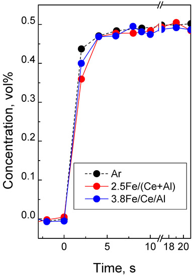 O2 transients recorded during the He/0.5 vol.% O2 switch following 60 s stay in He flow revealed the delay of O2 response compared with Ar (Figure 6) corresponding to adsorption of reasonably close quantities of oxygen (3 × 1019–5 × 1019 oxygen atom/g) by reduced sites in the 2.5 Fe/(Ce + Al) and 3.8 Fe/Ce/Al samples.