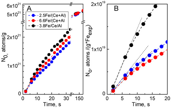 The rates of oxygen exchange in Fe/Ce-Al-O samples in the period of 0–60 s after the 16O/18O switch can be ordered as 3.8 Fe/Ce/Al > 6.6 Fe/(Ce + Al)>2.5 Fe/(Ce + Al), as follows from the slope of NO(t)/g dependencies (Figure 7A). It does not correlate with SBET values of the samples (Table 1) and Fes or Feexp values (Table 4). Moreover, the difference between 3.8 Fe/Ce/Al and Fe/(Ce + Al) samples becomes even more prominent when related to one surface Fe site (Figure 7B). Fast exchange proceeding with reasonably close to initial rate value in these samples during about 20–25 s includes a higher quantity of oxygen atoms (NO = 1 × 1021–2 × 1021 O atoms/g) than can be related to Fe, even with an account of that located in the bulk (~1.0 × 1021 O atoms/g in the 6.6 Fe/(Ce + Al) sample with the highest Fe content). Therefore, efficient exchange in the near-surface layers of Ce-containing compounds contributes to NO as well. Indeed, substantially more profound and faster oxygen exchange took place in Fe/CeO2 samples compared with Fe/Al2O3 [4]. However, both Ce content and Ceexp values are reasonably close in all samples (Table 4). We consider that the higher rate of exchange in the 3.8 Fe/Ce/Al sample can be due to preferential exposure of Fe-Ce mixed oxide or crystallized CeO2, including that bonded with clusters of FeOx or Fe-Al mixed oxides, while in 2.5 Fe/(Ce + Al) sample substantial part of Fe and Ce are included as preferentially isolated ions into Fe-Ce-Al mixed oxides that still retain alumina-like structure. Although Fe-Ce mixed oxide was detected in the 2.5 Fe/(Ce + Al) sample (Table 2, Figure S6), it obviously locates in bulk (Figure 2), like part of CeO2, and thus does not contribute to the fast oxygen exchange.