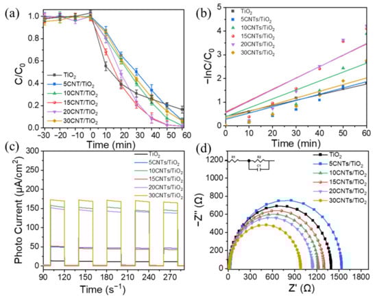 (a) The degradation activity of xCNTs/TiO2 under microwave and UV irradiation; the reaction temperature was 60 °C. (b) The kinetic fitting curve of MO degradation by xCNTs/TiO2. (c) Photocurrent spectra of TiO2 and xCNTs/TiO2. (d) Electrochemical impedance spectra of TiO2 and xCNTs/TiO2.