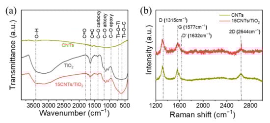 (a) The FTIR spectrum of CNTs, TiO2, and 15CNTs/TiO2. (b) The Raman spectrum of 15CNTs/TiO2 and CNTs.