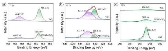 The XPS spectra of 15CNTs/TiO2 and TiO2: Ti 2p (a), O 1s, (b) and C 1s (c).