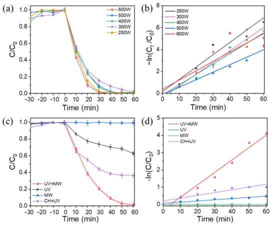 (a) The degradation activity and (b) the kinetics fitting curve of 15CNTs/TiO2 under UV with different power microwave irradiation. (c) The degradation activity and (d) the kinetics fitting curve of 15CNTs/TiO2 under different conditions.