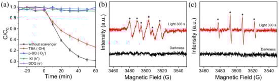 To determine the catalytic degradation mechanism under microwave photocatalysis, we measured the removal rate after the addition of radical trapping agents. The 15CNTs/TiO2 catalyst efficiently generated e−/h+ pairs in response to UV light [,], and the charge separation efficiency was sufficient for the reaction of photogenerated e−/h+ with adsorbed oxygen/H2O to generate a series of reactive oxygen radicals. When the hydroxyl radicals (•OH) were trapped, the MO removal rate decreased from 98.3% to 73.8%. After the superoxide radicals (•O2−), holes (h+), and electrons (e−) were trapped, the MO was almost not degraded (Figure 6a). The signals of DMPO-•O2− and DMPO-•OH were measured using the ESR spin trap technique. As shown in Figure 6b, the six characteristic peaks of the DMPO-•O2− radical sites can be observed. Another four characteristic peaks of DMPO-•OH also had an evident signal intensity ratio of 1:2:2:1, as shown in Figure 6c, while no such signal was detected in the dark. In conclusion, •OH, •O2−, e−, and h+ all had a positive effect on the reaction.