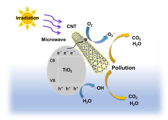 In general, photocatalytic advanced oxidation processes can efficiently mineralize organic pollutants into water and carbon dioxide [,]. In this work, hot spots and defects were formed on the catalyst surface under the thermal effect of microwaves to capture photogenerated electrons and improve the separation efficiency of the photogenerated carriers (Figure 7). The athermal effect of the microwave field had a polarizing effect on the catalyst, which improved the light absorption rate of the catalyst and promoted the activation of oxygen molecules and hydroxyl groups on the surface of the catalyst, generating more active oxygen radicals (•O2− and •OH) for the degradation of pollutants. It follows that the TiO2 generated electron-hole pairs under UV light irradiation, and the generated electrons were immediately transferred from the TiO2 to the CNT surfaces through the mutual bridging between the CNT/TiO2 interfaces, which effectively reduced the compound rate of the e−/h+. The separated e−/h+ drove the redox reaction in an aqueous solution. The h+ oxidized the water to form •OH, and the e− that were transferred to the carbon nanotubes reacted with the O2 to induce the reduction of oxygen to •O2− [,]. In the process, the unique structures of the CNTs not only improved the ability to capture light but also absorbed the energy generated by the microwaves and converted it into heat energy. At the interface with TiO2, the CNTs generated local super-hot spots to accelerate the mobility of photogenerated carriers, and finally achieved the purpose of improving the photocatalytic efficiency.