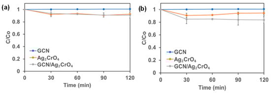 The dark adsorption of 2,4-D and Mecoprop-P on the synthesized photocatalyst are presented in Figure 1. It is obvious that GCN alone did not adsorb and thus there was no decrease in the concentration of 2,4-D or Mecoprop-P during the dark experiment. Equilibrium was reached within 30 min for Ag2CrO4 and GCN/Ag2CrO4. A total of 8.06% of 2,4-D was adsorbed on Ag2CrO4 while 9.32% of Mecoprop-P was adsorbed on Ag2CrO4. A total of 6.24% of 2,4-D was adsorbed on GCN/Ag2CrO4 while 15.32% of Mecoprop-P was adsorbed on GCN/Ag2CrO4. The photocatalytic degradation of GCN/Ag2CrO4 on the 2,4-D and Mecoprop-P in KillexR was investigated and the results are presented in Figure 2. In the control experiment, 2,4-D and Mecoprop-P did not decrease with irradiation by royal blue LED, indicating that the royal blue light (peak wavelength = 460 nm) did not degrade 2,4-D or Mecoprop-P. Using GCN, 16.85% of 2,4-D and 10.06% of Mecoprop-P degraded after 120 min. Ag2CrO4 remains largely unchanged under royal blue LED irradiation when compared to the dark experiment results. It was 7.05% for 2,4-D and 9.19% for Mecoprop-P. This is because silver-based photocatalysts are prone to photolysis and cannot stand long-run duration of photocatalytic degradation [30], and the low surface area of Ag2CrO4 (1.32 m2/g) [21] available for the adsorption of 2,4-D and Mecoprop-P and the eventual photocatalytic activity. Silver-based particles have been reported to aggregate [54] while GCN in the GCN/Ag2CrO4 nanocomposite serves to prevent the aggregation of Ag2CrO4. GCN/Ag2CrO4 showed the highest percent degradation for both 2,4-D and Mecoprop-P at 86.32% and 86.39% in 120 min.