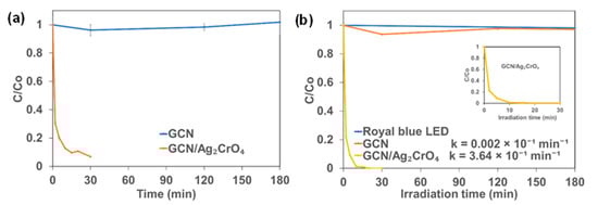The interaction between the synthesized photocatalysts and BSA in the absence of light (dark experiment) was investigated and the results are shown in Figure 3a. It was observed that the concentration of BSA did not change when GCN was present in the solution, indicating that the GCN had a negligible impact in the dark experiment. However, it was observed that the concentration of BSA decreased significantly by 93.1% in 30 min in the presence of GCN/Ag2CrO4. The photocatalytic degradation results of BSA are presented in Figure 3b. It shows that royal blue LED irradiation alone and GCN/royal blue LED irradiation could not degrade BSA. The royal blue LED with peak wavelength of 460 nm and low energy (2.7 eV) cannot alone degrade BSA with absorption peak of 280 nm and high energy (4.4 eV) indicating that BSA requires high energy radiation greater than 4.4 eV for degradation to take place. The GCN/royal blue LED could not degrade BSA because of the high electron-hole pair recombination rate of GCN owing to its medium band gap (2.7 eV). However, more than 99.9% of BSA was degraded in 20 min in the presence of GCN/Ag2CrO4 under royal blue LED irradiation. The first-order rate constant (k) values of GCN and GCN/Ag2CrO4 were calculated, and they are 0.002 × 10−1 min−1 and 3.64 × 10−1 min−1 respectively.