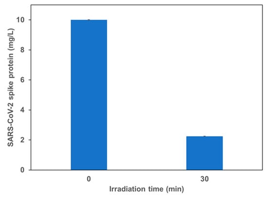In Figure 5, SARS-CoV-2 (Coronavirus) spike protein result is presented. It shows that GCN/Ag2CrO4 also can degrade the spike protein under royal blue LED. A photocatalytic degradation efficiency of 77.5% was achieved in 30 min. The lower degradation efficiency observed for SARS-CoV-2 spike protein (SP) can be attributed to its heavier molecular weight and structure. SARS-CoV-2 SP is 135 kDa and 1213 amino residues which is twice the size of BSA protein which is 66 kDa and 583 amino acid residues.