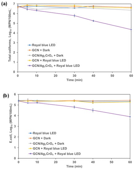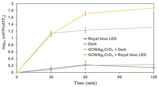 The interaction of silver compounds with the cell membrane of the bacteria is one of the important mechanisms of silver compound toxicity [54]. This can occur both in the dark and visible light irradiation. Over one log reduction was observed for ATP, total coliforms, and E. coli in 60 min during the photocatalytic degradation process. This indicates GCN/Ag2CrO4 can potentially photocatalytically inactivate, under royal blue LED irradiation, over 98% (1.7 log) of the microbial activity (ATP) in 60 min which includes inactivation of over 99.6% (2.43 log) of total coliforms.