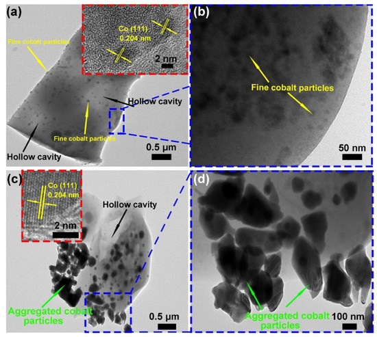 HR-TEM images of (a,b) HC–Co–YC–0.075M and (c,d) HC–Co–YC–0.05M.