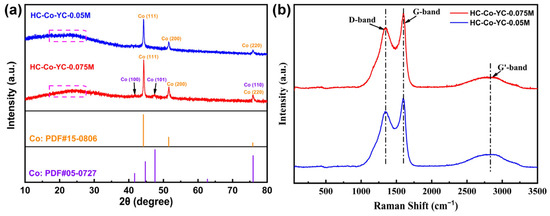 Figure 3a shows the XRD patterns of HC–Co–YC–0.05M and HC–Co–YC–0.075M. The XRD patterns confirm the existence of cubic cobalt in both samples. The two samples exhibited three typical diffraction peaks of cobalt, at 44.2°, 51.5°, and 75.8°, which were attributed to the (111), (200), and (220) planes of the cobalt phase, respectively (JCPDS 15-0806). Significantly, the HC–Co–YC–0.075M showed three weak diffraction peaks at 41.6°, 47.5°, and 75.9°, which indexed the (100), (101), and (110) planes of the cobalt phase, respectively (JCPDS 05-0727), suggesting the existence of hexagonal cobalt in HC–Co–YC–0.075M. Both samples also showed a broad diffraction peak at around 26° (pink dotted box in Figure 3a), corresponding to the (002) crystal planes of the low-crystallized carbon phase (JCPDS 75-1621) [32]. Here the peak at 26° was weak because its intensity was low as compared to the high-crystalline Co. In the Raman spectra (Figure 3b), the samples of HC–Co–YC–0.05M and HC–Co–YC–0.075M presented the D-band around 1347 cm−1 (related to the presence of amorphous carbon) and the G-band around 1595 cm−1 (associated with in-plane stretching vibrations of sp2 carbon bonds), which were characteristic to carbon-based material [33]. Concurrently, the occurrence of stacking disorder made the G′-band peaks ranged from 2500 cm−1 to 2800 cm−1 be broader [34,35]. The Raman results proved that the two samples had a feature of carbons with some ordering of the graphene basal planes.