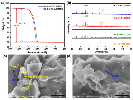 The composites of HC–Co–YC–0.05M/S and HC–Co–YC–0.075M/S were obtained by melting sulfur into HC–Co–YC–0.05M and HC–Co–YC–0.075M; the TGA curves in Figure 4a show that the sulfur contents in HC–Co–YC–0.05M/S and HC–Co–YC–0.075M/S were 68.72 wt% and 69.79 wt%, respectively. According to the TGA results, the temperature for complete evaporation of sulfur in HC–Co–YC–0.05M/S was higher than that for HC–Co–YC–0.075M/S, attributed to the weak interactions between the nonpolar sulfur and polar surface of carbon materials decorated with fine cobalt particles in HC–Co–YC–0.075M/S. The XRD patterns in Figure 4b further support successful loading of sulfur into the two composites; a succession of distinctive orthorhombic sulfur peaks is clearly visible in HC–Co–YC–0.05M/S and HC–Co–YC–0.075M/S. The homogeneous distributions of sulfur in the two composites of HC–Co–YC–0.05M/S and HC–Co–YC–0.075M/S are presented in Figure 4c,d. Numerous fine cobalt particles were observed on the surface of the yeast-based carbon materials in the HC–Co–YC–0.075M/S composite (Figure 4c). Furthermore, EDS elemental mapping images of HC–Co–YC–0.075M/S revealed that carbon, nitrogen, oxygen, phosphorus, cobalt, and sulfur were well-distributed on the surface of the carbon materials, with a small quantity of aggregated cobalt particles present outside of the carbon materials (Figure 5a—Co). The homogeneously distributed N, O, P, and Co on the surface of the carbon materials could be in close contact with sulfur, thereby minimizing the shuttle effect of LiPSs and enhancing the cycle stability of the Li–S battery. The chemical adsorption of LiPSs by these naturally doped nitrogen, oxygen, and phosphorus elements in yeast-based carbon is more efficient than the physical adsorption of carbon powder with a high specific surface area (such as super P and Ketjen black) for LiPSs. In contrast to HC–Co–YC–0.075M/S (Figure 5b—Co), many aggregated cobalt particles were discovered outside of the carbon materials in HC–Co–YC–0.05M/S, which was compatible with the SEM (Figure 1d,f) and TEM data (Figure 2c,d). The chemisorption ability of cobalt to polysulfides was reduced by the lower surface-to-volume ratio of aggregated cobalt particles [36].