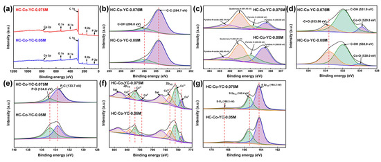 Surface chemical valence states of HC–Co–YC–0.075M/S: (a) XPS survey, (b) C 1s spectrum, (c) N 1s spectrum, (d) O 1s spectrum, (e) P 2p spectrum, (f) Co 2p spectrum, and (g) S 2p spectrum.