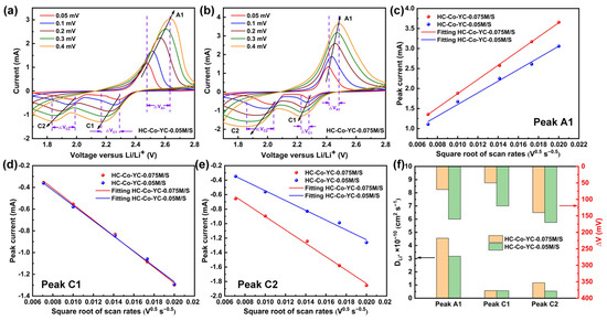 CV curves of (a) HC–Co–YC–0.05M/S and (b) HC–Co–YC–0.075M/S under different sweep rates of 0.05–0.4 mV s−1, (c–e) peak currents versus the square root of scan rates of HC–Co–YC–0.05M/S and HC–Co–YC–0.075M/S, and (f) polarized voltage and Li-ion diffusion coefficient comparison of HC–Co–YC–0.05M/S and HC–Co–YC–0.075M/S.