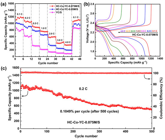 Electrochemical (a) rate capabilities of the HC–Co–YC–0.075M/S, HC–Co–YC–0.05M/S, and YC/S electrodes; charge–discharge voltage curves of the (b) HC–Co–YC–0.075M/S; and (c) long-term cycle stabilities of the HC–Co–YC–0.075M/S electrode at 0.2 C.