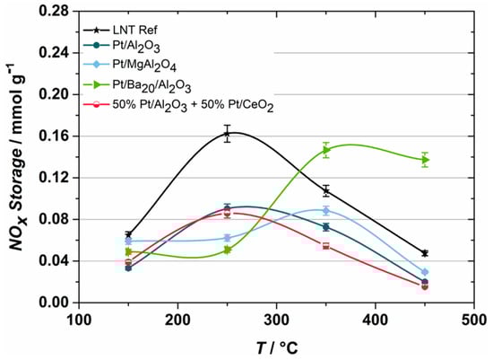 First, the temperature dependent NOX storage capacities of the individual washcoat components and a mixture of 50% Pt/Al2O3 + 50% Pt/CeO2 in comparison to the reference LNT were investigated (Figure 1). As expected, the fully formulated LNT has the maximum NSC of 162 µmol/gCat at which corresponds to a storage capacity of around 2 g NO2 equivalent with a normal washcoat loading of 250 g/L on the monolith at this temperature. As the basic washcoat support material platinized alumina (Pt/Al2O3) has a considerable NSC at temperatures below which supports the findings of Sedlmair et al. [38] and Epling et al. [10]. A replacement of 50% of the alumina with the bulk of Pt coated ceria (50% Pt/Al2O3 + 50% Pt/CeO2) does not have a remarkable impact on the NOX storage performance compared to NSC of the individual alumina over the complete temperature range. A lower NOX storage capacity at temperatures below can be detected with Pt doped barium oxides (Pt/Ba20/Al2O3) in comparison to the single aluminum oxides (Pt/Al2O3). It was already indicated by Olsson et al. [15] that much more platinum oxides are formed on Pt/Ba20/Al2O3 than Pt/Al2O3, which leads to a negative effect on NO oxidation at low temperatures, because the formation and stability of the less reactive Pt oxides blocks the active Pt sites and reduces the exposed surface area of metallic Pt and other PGMs. Therefore, NO2 formation and thus NOX adsorption over the nitrate route on barium slows down and results in a lower NOX storage capacity at low temperatures. At higher temperatures, the stability of the platinum oxide decreases, leading to an enhanced exchange rate of the gas species involved on the platinum surface and thus increasing the NO oxidation performance. At high temperatures, such and . However, the NOX storage level of the individual barium oxides is even higher than that of the optimized reference LNT. Comparable NOX storage to the reference is achieved with the platinized Mg spinel at . Apparently, the same kinetic limitation of NO oxidation activity on the Pt sites, found for the Pt/Ba20/Al2O3 catalyst at these low temperatures, was also dominant for the platinized Mg spinel system. With increasing temperature, the MgAl2O4 can store slightly more NOX. Nonetheless, it is not at the level of the Ba-containing materials or the reference LNT.