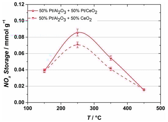 To determine the effect of the Pt loading on ceria in particular, NSC measurements were also performed on a non-activated CeO2 in the mixture of 50% Pt/Al2O3 + 50% CeO2, which was compared in Figure 2 with the Pt-activated ceria-based substance (50% Pt/Al2O3 + 50% Pt/CeO2). Both systems reached the maximum NOX storage capacity at . However, the Pt activation significantly shifts the NSC in the medium temperature range up to 20% at and 30% at . This exhibits the influence of the Pt sites on ceria surface on the NOX storage performance, especially in the medium temperature range.