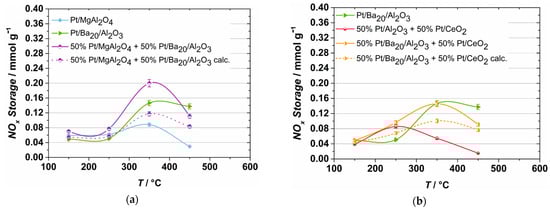 Another batch of physical mixtures of the individual catalysts were investigated under same boundary conditions in order to find synergistic effects. Figure 3 shows the NOX storage capacities of a mixture of 50% Mg spinel and 50% BaO (50% Pt/MgAl2O4 + 50% Pt/Ba20/Al2O3) (see Figure 3a) as well as a mixture of 50% ceria and 50% BaO (50% Pt/CeO2 + 50% Pt/Ba20/Al2O3) (see Figure 3b) compared to their single compounds. In addition, a calculated value of the expected NOX storage capacity regarding to their mixture composition is plotted for both diagrams in Figure 3. The expected NSCs were determined via Equation (1), where indicates the NOX storage capacity of the individual materials, and gives the volume fraction of each material in the physical mixture at certain temperatures.