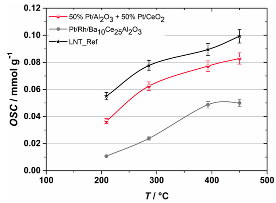Another crucial aspect of modern LNTs is their oxygen storage capacity (OSC), which is mainly provided by the platinized ceria component in the washcoat. This can significantly influence the regeneration behavior by additionally oxidizing the reductants during the initial phase at the beginning of rich conditions, thus leading to a less efficient and extended NOX regeneration [8]. For this reason, OSC of the ceria containing catalysts and of the reference LNT are evaluated at various temperatures. The results of these OSC measurements are shown in Figure 5.