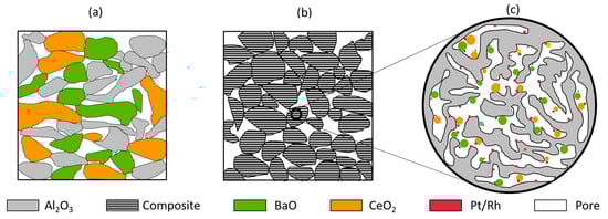 To illustrate the effect of this measure, the textures of both catalysts are shown schematically in Figure 6. The washcoat of the reference LNT (see Figure 6a) consists of a physical mixture of PGM-loaded alumina (light grey) and ceria (orange) phases with grain sizes between 2 to 5 µm. The BaO phase (green) with a comparable grain size is randomly distributed within this matrix. According to this texture, long diffusion pathways of the NO2 molecules must be bridged from the active precious metal centers to the storage sites of the support materials (e.g., from Pt to BaO).