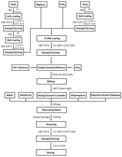 The AlO(OH) sol used was prepared by mixing 45 g of boehmite powder (Disperal, Sasol, Germany) with 96 mL of water and 9 mL of 2 M nitric acid. The resulting suspension was dispersed at 8000 rpm by an Ultra turrax. After a few days of rest at room temperature under ambient conditions, a viscous gel was obtained before use. The complete process for preparing the catalyst samples is summarized in the flow chart in Figure 7.