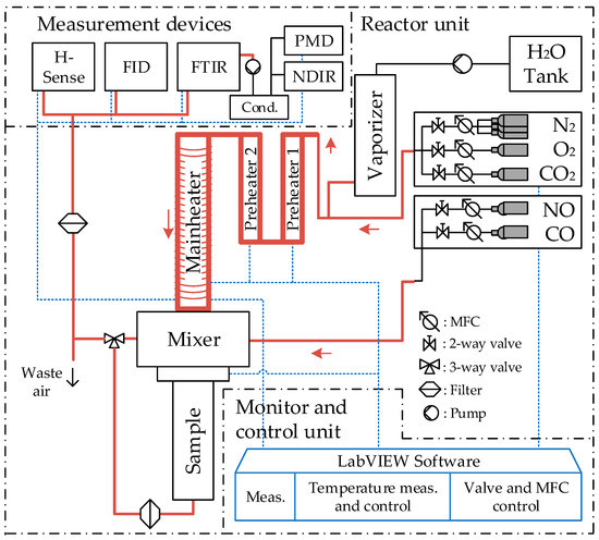 In order to investigate the NOX and oxygen storage behavior of the different catalytic materials under defined boundary conditions, a laboratory gas test bench (LGB) was used. The schematic of the LGB is shown in Figure 8. The test bench mainly consists of a reactor part, in which the sample, flow controller, heater, and valves are installed, a LabVIEW-based control and regulation unit, and the measurement technology. The capabilities of the test bench have already been published elsewhere [8,39,40,41,42].