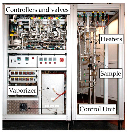 Various measuring instruments are used to determine the concentrations of different gas species. After filtering, the entire gas flows through a Fourier transform infrared spectrometer (FTIR) MultiGas 2030 from MKS Instruments, Inc. (Andover, MA, USA) to analyze H2O, CO, CO2, NO, NO2, N2O, and NH3 concentrations with high accuracy. All measurement data were evaluated with a frequency of 1 Hz. A picture of the LGB with the main components and the sample is shown in Figure 9. The measurement devices are positioned on the other side of the test bench.