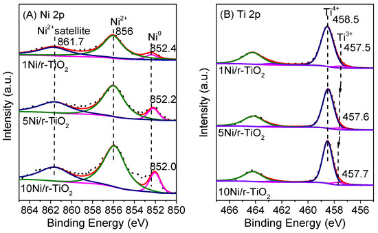 (A) Ni 2p and (B) Ti 2p XPS spectra of 650 °C-reduced 1Ni/r-TiO2, 5Ni/r-TiO2, and 10Ni/r-TiO2.