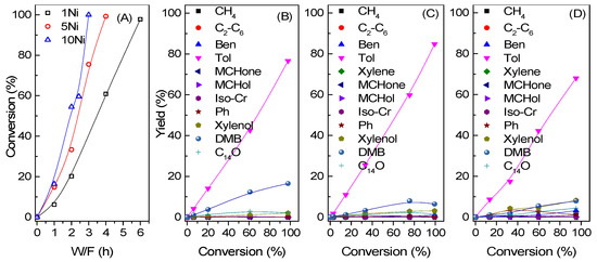 Conversion rate as a function of W/F (A) and product yields with change in conversion over (B) 1Ni/r-TiO2, (C) 5Ni/r-TiO2, and (D) 10Ni/r-TiO2. Reaction conditions: T=350 °C, P = 1 atm, H2/m-cresol = 50, TOS = 30 min. Ben, Tol, MCHone, MCHol, Iso-Cr, Ph, DMB, and C14O represent benzene, toluene, methylcyclohexanone, methylcyclohexanol, cresol isomers, phenol, dimethylbiphenyl, and 5,5´-dimethyl-3-hydroxybiphenyl, respectively.