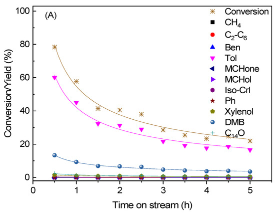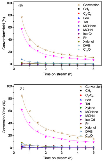 As shown in Figure 10, the three catalysts showed a similar deactivation trend with time on stream. The conversion decreased rapidly in the first 2 h, and then the deactivation became very slow. It is important to note that Tol is always the dominant product, which likely indicates the deactivation is due to the loss of the number of active sites.
