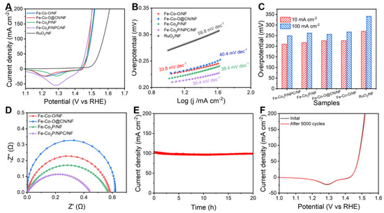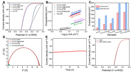 The HER performance of different catalysts: (A) polarization curves, (B) Tafel slope, (C) overpotentials, (D) EIS Nyquist plots, (E) chronoamperometry curve of Fe-Co2P/NPC/NF recorded for 20 h at 100 mA cm−2, and (F) polarization curves of Fe-Co2P/NPC/NF before and after stability testing.