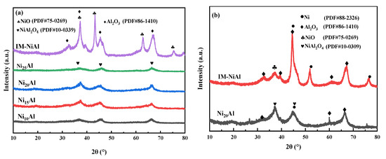 XRD patterns of NixAl and IM-NiAl catalysts: (a) after calcination and (b) after reduction.
