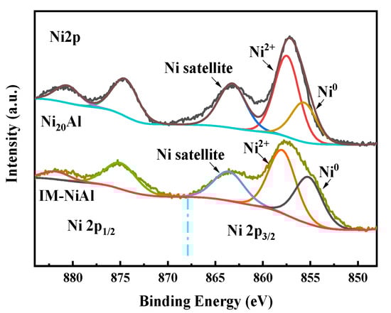 Figure 4 shows the XPS spectra of the reduced Ni20Al and IM-NiAl catalysts. The peak around 857.9 eV for Ni 2p3/2 was attributed to the Ni2+ species in the surface of the catalyst, indicating the presence of Ni2+ in the reduced Ni20Al and IM-NiAl [27]. The peak at 863.5 eV was the satellite of Ni 2p3/2. In general, the binding energy peak position of Ni2+ 2p3/2 of NiO was located around 855.8 eV, and the satellite peak binding energy peak position at the edge of Ni2+ 2p3/2 was located at 861.8 eV. The shift of the binding energy to a higher position for the reduced Ni20Al and IM-NiAl catalyst indicated that there was an interaction between the nickel species and the carrier alumina [28,29], which was also verified by the XRD results above. In addition, a peak of Ni0 was observed in the XPS spectra of both the reduced Ni20Al catalyst and the IM-NiAl catalyst, indicating that a fraction of NiO was reduced. The peak splitting process was performed on the Auger spectrum, and the results showed that the Ni2+ content in the Ni20Al catalyst was 60.43%, while the Ni2+ content in the IM-NiAl catalyst prepared by the impregnation method was 45.81%. The results indicate that the nickel species in the IM-NiAl catalyst had a relatively weak interaction with the carrier and was easily reduced to Ni0, which made the IM-NiAl catalyst prone to agglomeration during the reaction. Furthermore, the Ni20Al catalyst contained more NiAl2O4 crystalline phases with a stronger interaction between the nickel species and the carrier, which limited the reduction of Ni2+.