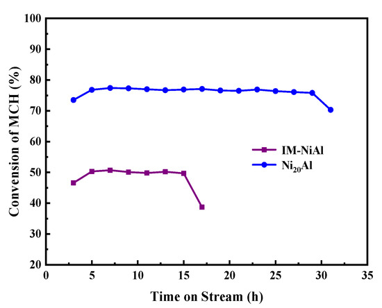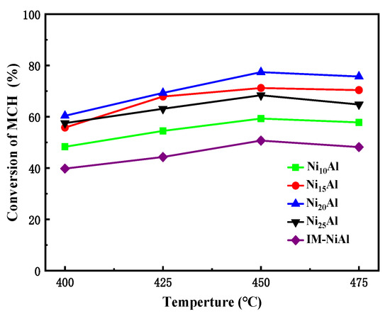 The effects of the nickel content of the NixAl series catalysts and temperature on the dehydrogenation of MCH were firstly studied and the results are shown in Figure 5. At the same temperature, the conversion of MCH increased and then decreased with the increase in the nickel content of the NixAl series catalysts. Specifically, the conversion of MCH was gradually increased when the nickel content increased from 10% to 20%, but began to decrease when the nickel content continued to increase. The main reason was that with the nickel content increased, the nickel was uniformly dispersed on the carrier, providing enough active sites for the catalyst, and thus increasing the catalyst activity; however, as the nickel content continued to increase, it led to a rapid decrease in the specific surface area of the carrier, which could not provide enough active sites for the active center, resulting in a large amount of nickel agglomeration, and thus reducing the activity of the catalyst. Therefore, the optimum nickel content of the catalyst was 20%. Subsequently, at the same nickel content, the effect of the reaction temperature on the dehydrogenation of MCH over the Ni20Al catalysts prepared by the modified co-precipitation method and the IM-NiAl catalysts prepared by the conventional impregnation method was studied. The results showed that the conversion of MCH firstly increased and then decreased with the increase in the reaction temperature. This phenomenon is due to the fact that the MCH dehydrogenation is a heat-absorbing reaction, thus the conversion of MCH increased with the elevation of temperature at the beginning step. The conversion of MCH over the IM-NiAl catalyst prepared by the impregnation method was only 50.7% at an LHSV of 4 mL g−1 h−1 and a reaction temperature of 450 °C, while that was up to 77.4% for the Ni20Al catalyst prepared by a modified co-precipitation method under the same conditions, which was mainly due to the larger specific surface area, smaller particle size, and better dispersion of the Ni20Al catalyst.