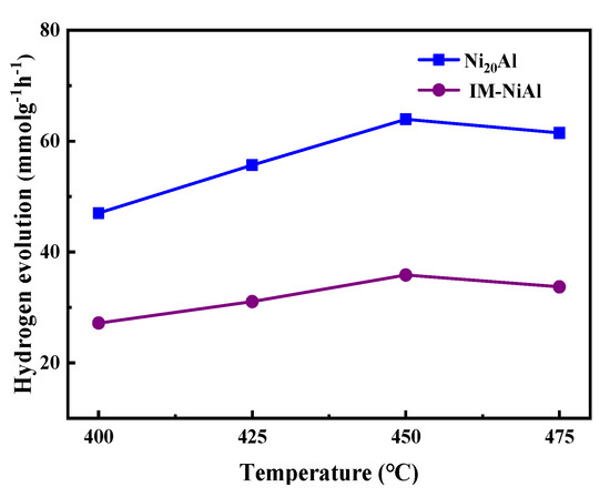 The hydrogen release rates in the dehydrogenation of MCH at different temperatures over the Ni20Al and IM-NiAl catalysts are shown in Figure 7. It increased and then decreased with the gradual increase in temperature over both the catalysts. The hydrogen release rate over the Ni20Al catalyst increased from 47.01 to 63.94 mmol g−1 h−1 at the range of 400–450 °C, but started to decrease after the temperature was further increased. The optimized hydrogen release rate over the Ni20Al catalyst was 61.47 mmol g−1 h−1, which is superior to that of the IM-NiAl catalyst prepared by the conventional impregnation method (35.84 mmol g−1 h−1).