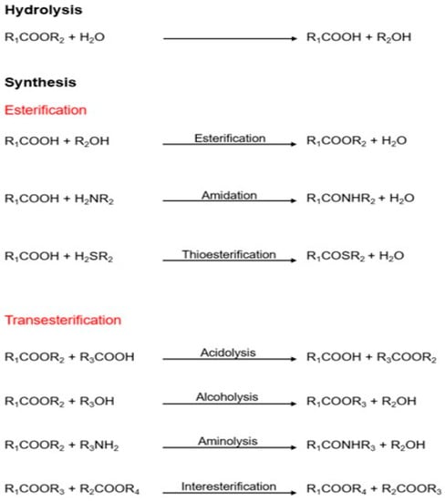 These enzymes can hydrolyze triglycerides to obtain free fatty acids, monoacylglycerols (MAGs), diacylglycerols (DAGs), and glycerol; on the other hand, they can synthesize new products in organic media by esterification, transesterification, and aminolysis mechanisms (Figure 1) [15,16]. Lipases have a highly conserved catalytic triad comprising serine as a nucleophile, an aspartate/glutamate as an acidic residue, and histidine. In their active conformation, lipases present in their active center a group of hydrophobic residues arranged around the catalytic serine that constitute an electrophilic region known as an oxyanion cavity. Lipases are also characterized by the presence of disulfide bridges that give them stability and are critical for their catalytic activity [16]. Some lipases also have a structural feature covering the active site, called the “lid,” that opens at hydrophobic/hydrophilic interphases. Ancient classifications denoted esterases as lipolytic enzymes lacking a lid. However, because some lipases, such as Candida antarctica lipase B (CALB), lack the lid, an alternative classification has been proposed [17].