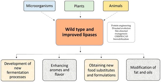 Lipases have been improved using natural evolution techniques, protein engineering, bioinformatics design, directed evolution, saturation mutagenesis, site-directed mutagenesis, and DNA shuffling [26]. However, in the food industry, the native form is often preferred (Figure 2).