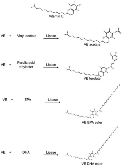 Examples of derivates of vitamin E (α-tocopherol) catalyzed by lipases. VE: Vitamin E; EPA: eicosapentaenoic acid; DHA: docosahexaenoic acid [125,126,127].