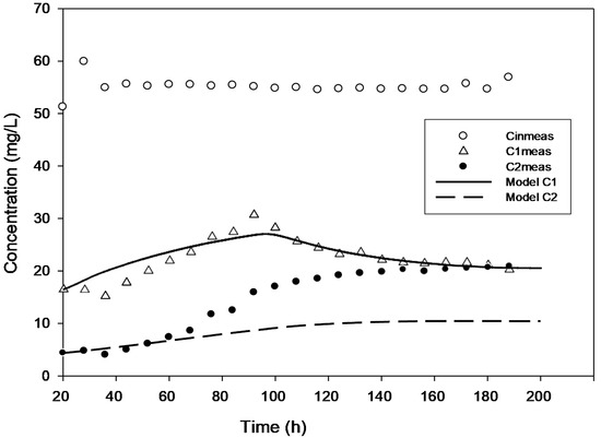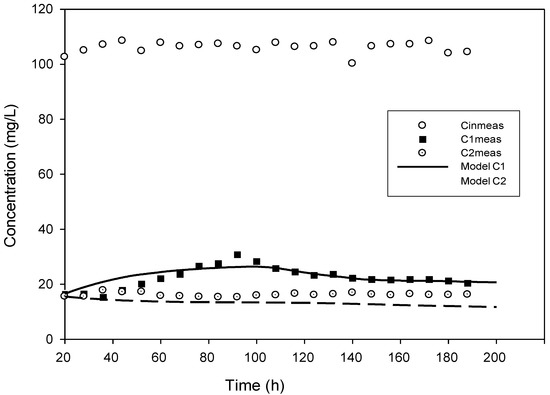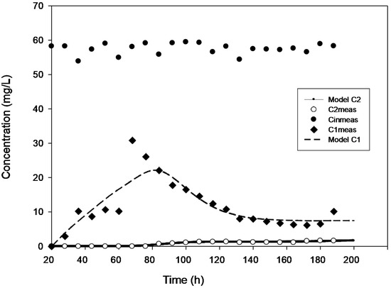True steady state conditions were not possible because the reactor was run at 2–3 HRTs every cycle. However, the reaction-rate kinetics were assessed under a transient condition using AQUASIM 2.0 software in order to create a more realistic modelling effort. The findings of comparing experimental and modelled concentration values for the various initial 4-CP concentrations utilized in the current study are shown in Figure 1, Figure 2, Figure 3, Figure 4 and Figure 5. These findings show that with the exception of Figure 3, where the model was unable to accurately monitor the 4-CP concentration profile, the model’s simulation of the experimental data and its fitting to those data are both satisfactory. A perfect stoichiometric chloride release was recorded, and prior research on the bio-degradation of chlorophenols revealed that the accumulation of intermediates was low [35]. This is supported by the experimental data’s reasonably strong fit (R2 > 0.97) given that the Haldane model was said to be insufficient in the presence of those metabolic intermediates [33].