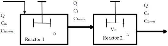 The combined chemical and biological treatment system employed in this study included a 22.8 L photoreaction chamber, followed by a 32.7 L biological reactor, both made of Perspex glass, a 9-Watt (W) UV lamp, a feed pump, and a UV-recycle pump. The biological reactor’s dimensions were 447 × 348 × 246 mm (L × B × H), whereas the photoreactor’s dimensions were 300 × 295 × 295 × 295 mm (L × B × H). The two reactors were run as CSTRs that were connected in series. It was anticipated that Reactor 2 will use phenolic compound breakdown products as carbon sources. A continuous influent feed was introduced at a flowrate of 0.200 Lh−1 to allow enough retention for degradation of 4-CP in only one pass through the reactor. Since the model had to account for these radicals, a degradation reaction was created. The functions of effluent C1 from reactor 1, a chemical reactor, and C2 from reactor 2, a biological reactor, are used to represent the reaction rates in Figure 6. Equations (1) and (8) are the formulas for the generalized rate equation for the degradation of 4-CP.
