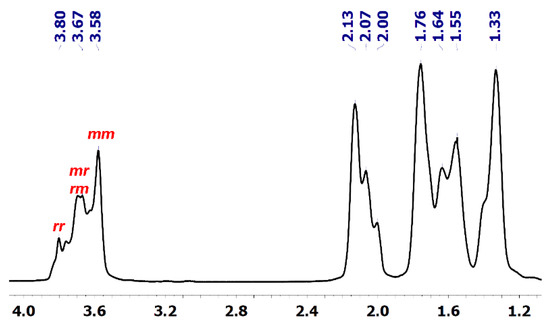 To gain information on the CHO polymerization mechanism catalysed by 1, the tacticity of the PCHOs was investigated by 1H and 13C NMR spectroscopy. The methine regions of the 1H NMR and 13C NMR spectra, respectively, at 3.58–3.80 ppm (Figure 1) and 76.71–78.64 ppm (Figures S9–S11), are diagnostic of the polymer stereochemistry. The threo-disyndiotactic triad (rr) resulting from the stereoselective anti opening of the oxirane ring produces broad 1H signals centred at about 3.8 ppm, whereas the corresponding heterotactic (mr) and threo-di isotactic triads (mm) are observed as a broad signal centred at 3.75 ppm and sharp signal at 3.55 ppm, respectively [27,28,29]. The integration of methine signals at 78.64, 78.11 and 76.7–77.7 ppm in the 13C NMR spectrum, which is better resolved than the corresponding 1H pattern, provides a ratio of about 1:1:1 for the threo-diisotactic, heterotactic and threo-disyndiotactic diads, respectively (Figure S11; Entry 5, Table 1; see additionally COSY and HSQC spectrum of Figures S12–S14, respectively, for the corresponding assignments). The noteworthy cationic polymerization of CHO initiated by strong Brønsted or Lewis acids such as ZnR2/H2O (R = Et, Ph) [(ZnEt2/H2O) [30,31,32] or metal catalysts such as yttrium alkoxides [33] and aluminium amine-phenolate catalysts [34] yielded PCHOs with the same NMR fingerprints. The polymer structure was in all cases defined as atactic, not considering that a truly atactic pattern would correspond to the intensity ratio of 1:2:1 for the threo-diisotactic, heterotactic and threo-disyndiotactic diads. Independently of the proposed polymerization mechanism, namely, coordination/insertion (with metal alkoxides), active chain end mechanism (ACE) (ionic polymerization) or activated monomer mechanism (AMM), the resulting PCHOs show the same stereoregularity possibly resulting from a chain end stereocontrol.