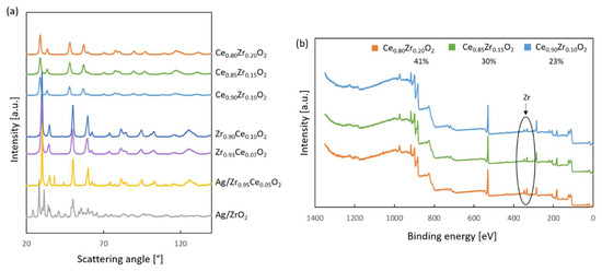 The X-ray photoelectron spectroscopy (XPS) was performed on a K-Alpha device (Thermo Scientific, Waltham, MA, USA). Survey spectra (200 eV, 1 eV/step) and the following detailed spectra (50 eV, 0.1 eV/step) were collected: C 1s (extended to 305 eV to include the K 2p doublet), O 1s, Ce 3d and Zr 3d, as well as Au 4f and Ag 3d. After a Shirley-type background subtraction, the spectra were calibrated to 285.0 eV for C 1s.