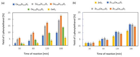 Figure 2 depicts the 1-phenylethanol yields obtained on the Ce1−xZrxO2 and Zr1−xCexO2 supports. It can be seen that the yield of 1-phenylethanol increased with time for all catalyst supports and that the activity of the zirconium-doped ceria samples was substantially higher than that of pure ceria. There was a strong dependence of the yield of 1-phenylethanol on the zirconium loading (Figure 2a). The order of activity was as follows: 10%, 15%, 5%, 20%. This implies that there is an optimum doping of ceria (at about 10% Zr), which allows for the formation of the largest number of active sites. The addition of 5% of Zr was not enough, whereas 15% was already slightly too much and 20% was substantially too much. Despite the trend of the activity of the supports themselves, the support with 15% Zr was used for Au and Ag deposition due to the series of previously performed studies carried out by our group in other reactions [45,46,47] in order to obtain a greater insight into the same type of catalytic systems.