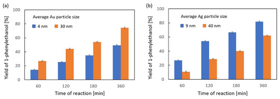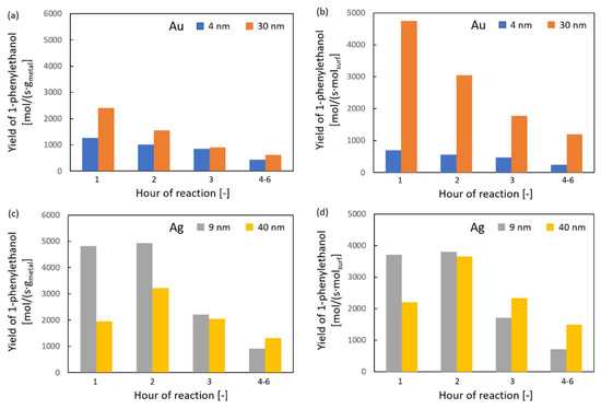 A comparison of the results of the activity tests of the supported gold and silver catalysts is presented in Figure 6, in which the number of moles of the desired product is referred to the mass of the active phase (Figure 6a for Au and Figure 6c for Ag) and the different number of moles of the active phase on the surface, due to different particle size (Figure 6b for Au and Figure 6d for Ag). It can be seen that the silver catalysts were much more active per gram of active phase than the gold catalysts (Figure 6a,c). Moreover, a difference in the conversion in time could be observed, namely, the gold catalysts were the most active during the first hour of reaction, after which the rate of 1-phenylethanol formation decreased. In contrast, the silver catalysts had a similar or higher rate of product formation in the second hour of the catalytic reaction than in the first. When taking into account the particle size (Figure 6b,d), and hence the number of surface moles of the active phase, it can be seen that for the gold catalysts, the difference in the rate of product formation is strongly dependant on the size of the active phase particles, whereas the rate on silver catalysts does not differ as much for the two studied particle sizes.